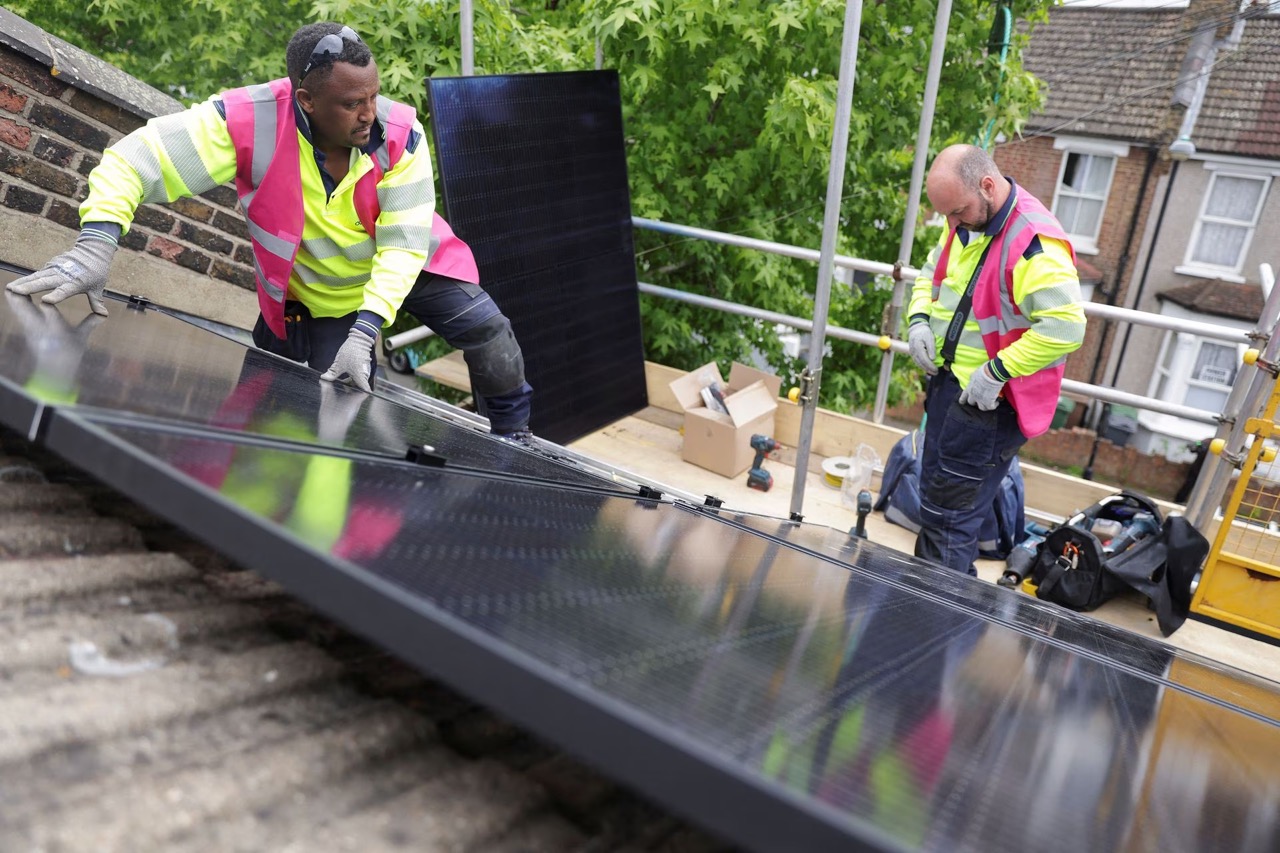 Octopus Energy engineers install solar panels for Walthamstow's 'POWER STATION' project (Source: REUTERS/Anna Gordon)